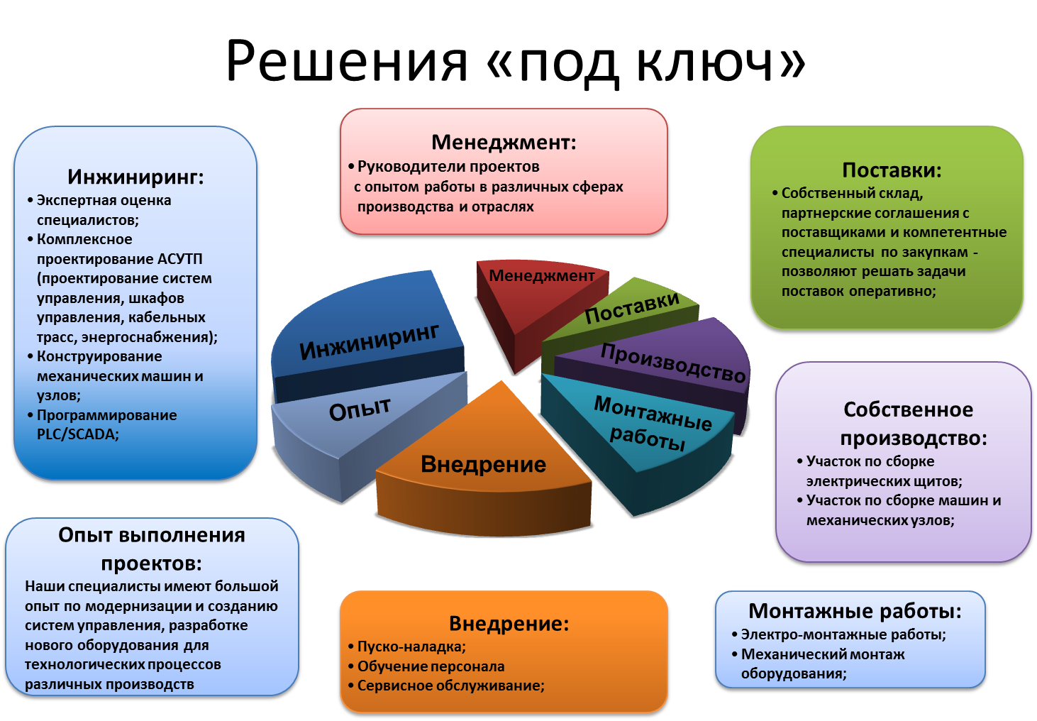 В современном мире сложно представить современное производство без технологически емких производств. Для внедрения технологических комплексов мы предлагаем воспользоваться нашей услугой проект “под ключ”. Комплексный подход в решении задач автоматизации позволяет создавать индивидуальные решения, максимально соответствующие специфике предприятия. Мы предлагаем услугу внедрение проектов автоматизации “под ключ” - от подготовки бизнес-процессов и подбора оборудования до внедрения оптимальной АСУТП точно в срок и в рамках оговоренного бюджета.
